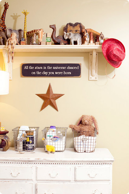 Los juguetes antiguos pueden ayudarnos a dar un toque vintage a una habitación infantil. Mirad que bonitos quedan estos animalitos de plástico de los 50.