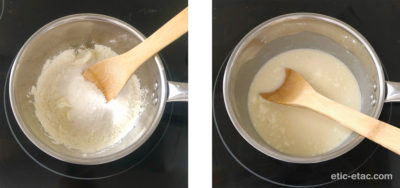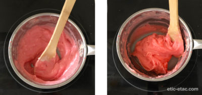 Echa unas gotas de colorante alimentario antes de que la masa empiece a espesar (además del colorante puedes echar unas gotas de aceite aromático 🙂 ). Sigue mezclando sin parar hasta que veas que la masa se va secando y se forma una bola (de 3 a 6 minutos aproximadamente dependiendo de la temperatura del fuego). Cuando veas que se ha evaporado el agua, retira el cazo del fuego.